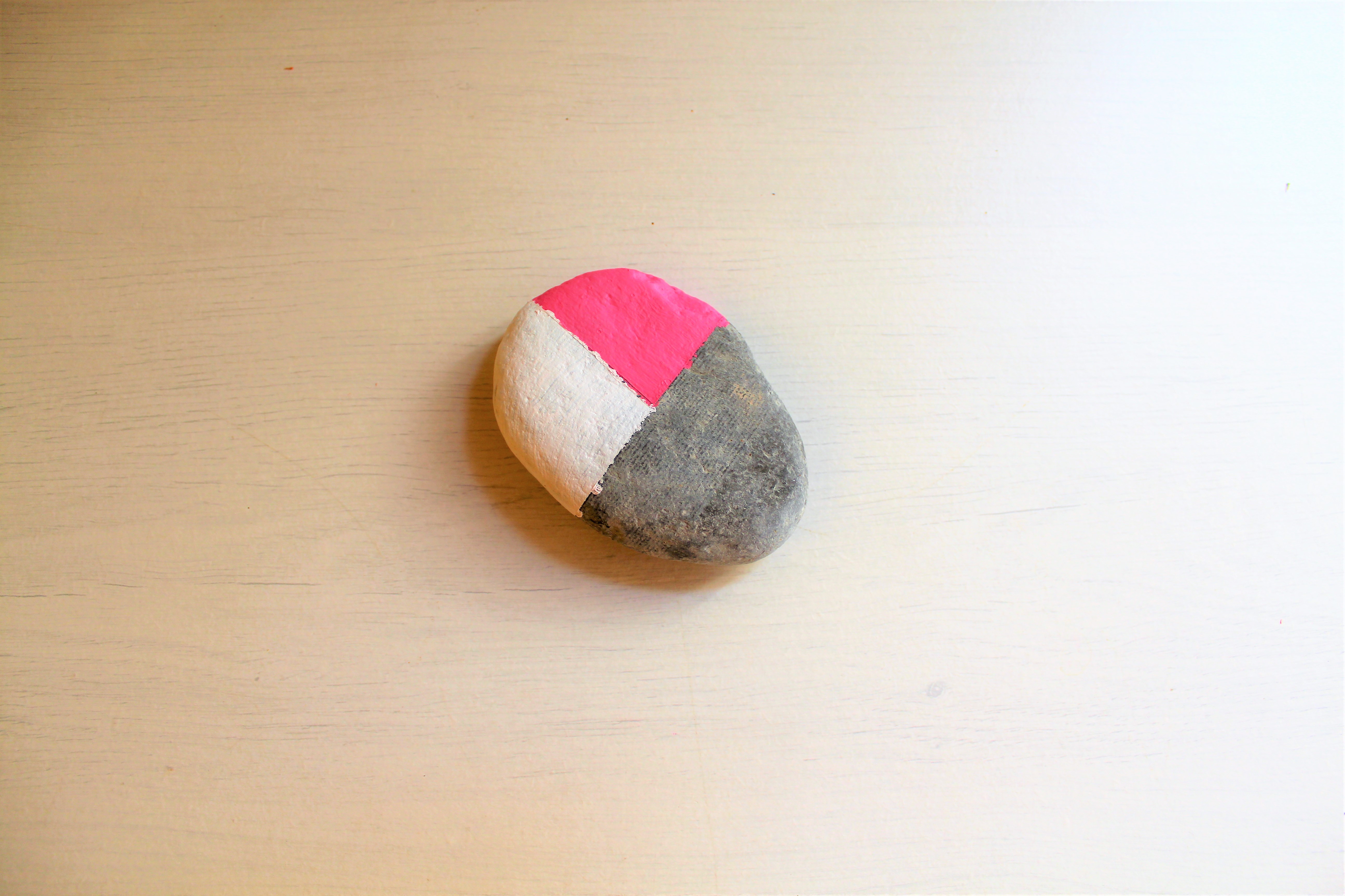Questa è la fase in cui ti mostro come decorarlo, ed io per il mio sasso ho scelto uno stile un po' nordico. Con il nastro adesivo di carta dividi il sasso in tre parti tra loro asimmetriche. In realtà puoi dividerlo in quante parti vuoi, oppure decorarlo scegliendo una tinta unita e quindi saltare la fase della divisione tramite il nastro di carta. Puoi anche riprodurre una fantasia se sei abile a disegnare...